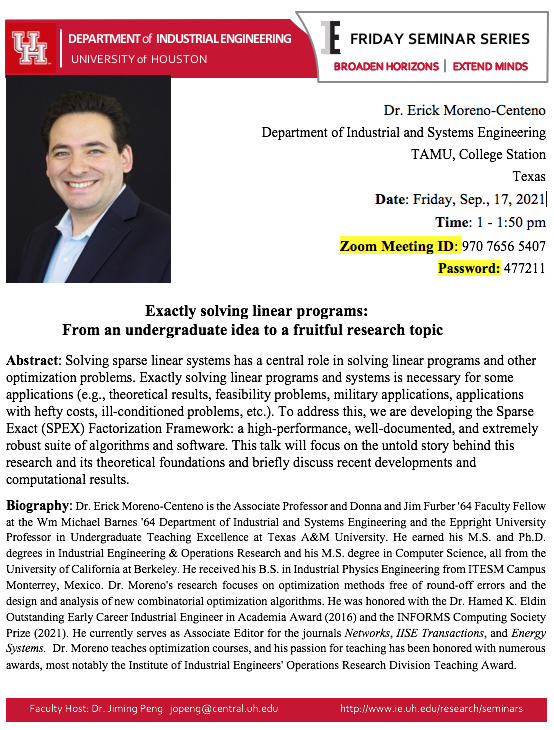 IE Friday Seminar Series: Exactly solving linear programs: From an undergraduate idea to a fruitful research topic ( 9/17)