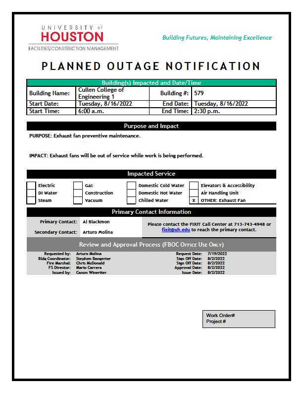 [CCoE Notice] EXHAUST FAN OUTAGE - #579 CULLEN ENGINEERING 1 (AUG. 16)