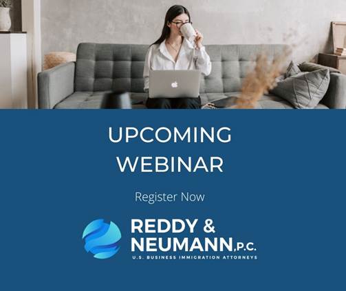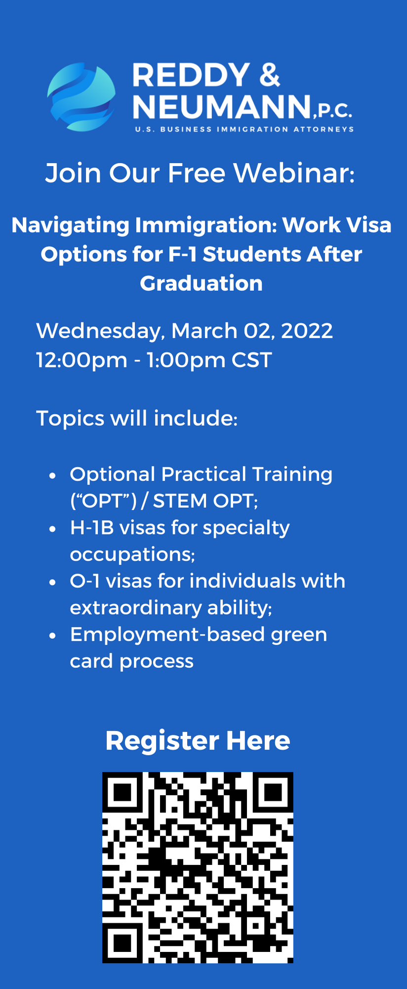 Reddy & Neumann, P.C. invites you to join our free webinar "Navigating Immigration: Work Visa Options for F-1 Students After Graduation" on Wednesday, March 02, 2022 from 12:00pm to 1:00pm CST.