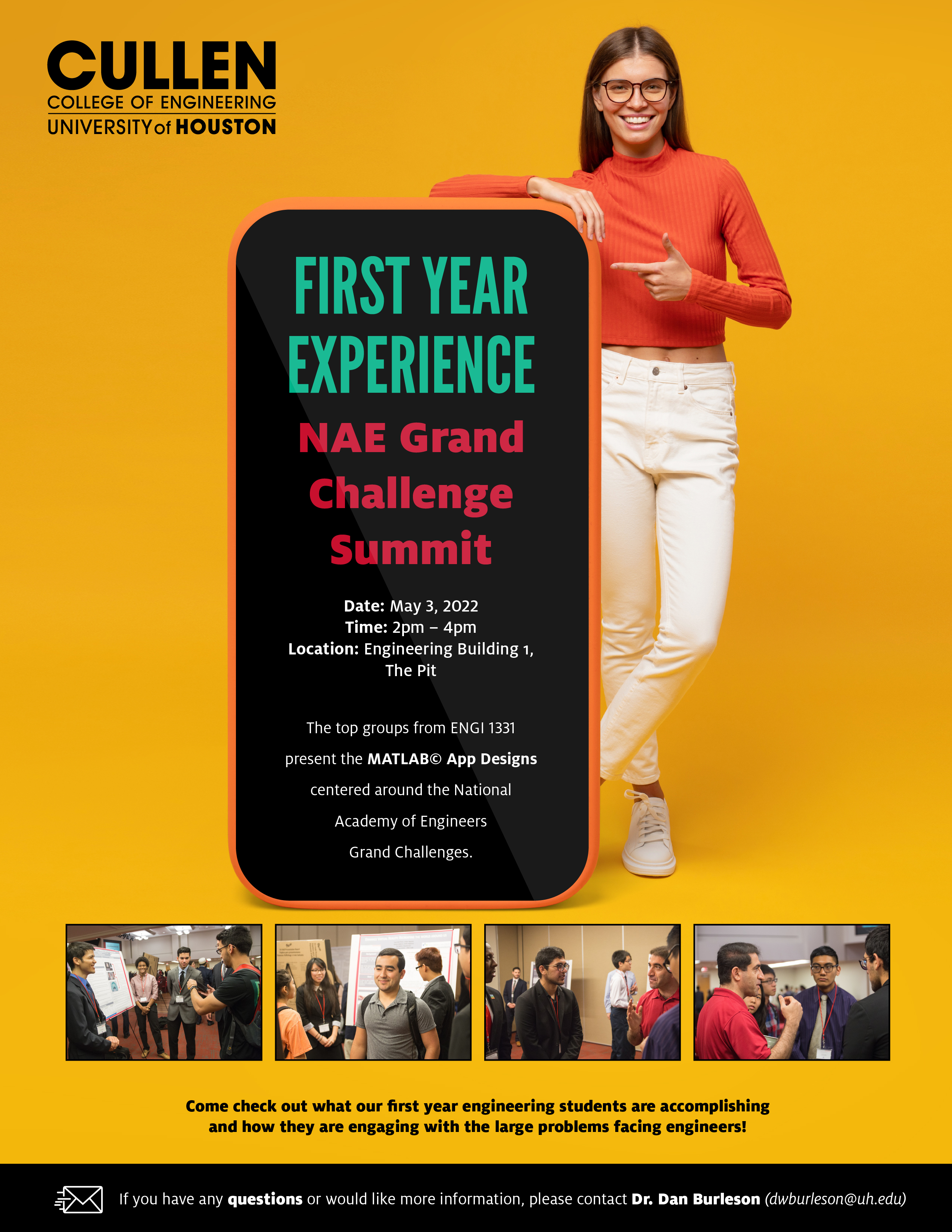 The event will highlight the top semester projects from ENGI 1331 where students developed a MATLAB App centered around the National Academy of Engineers Grand Challenges. Come check out what students have accomplished and the newly established UH Grand Challenge Scholars Program!