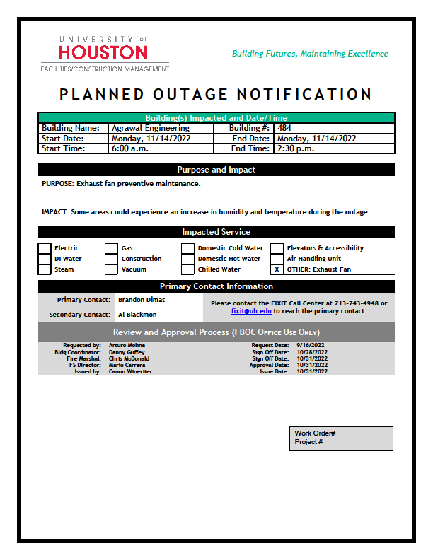Please review the attached outage notification at your earliest convenience and plan accordingly. Report any facilities-related issues to FIXIT<https://uh.edu/facilities-services/services/fixit/>.