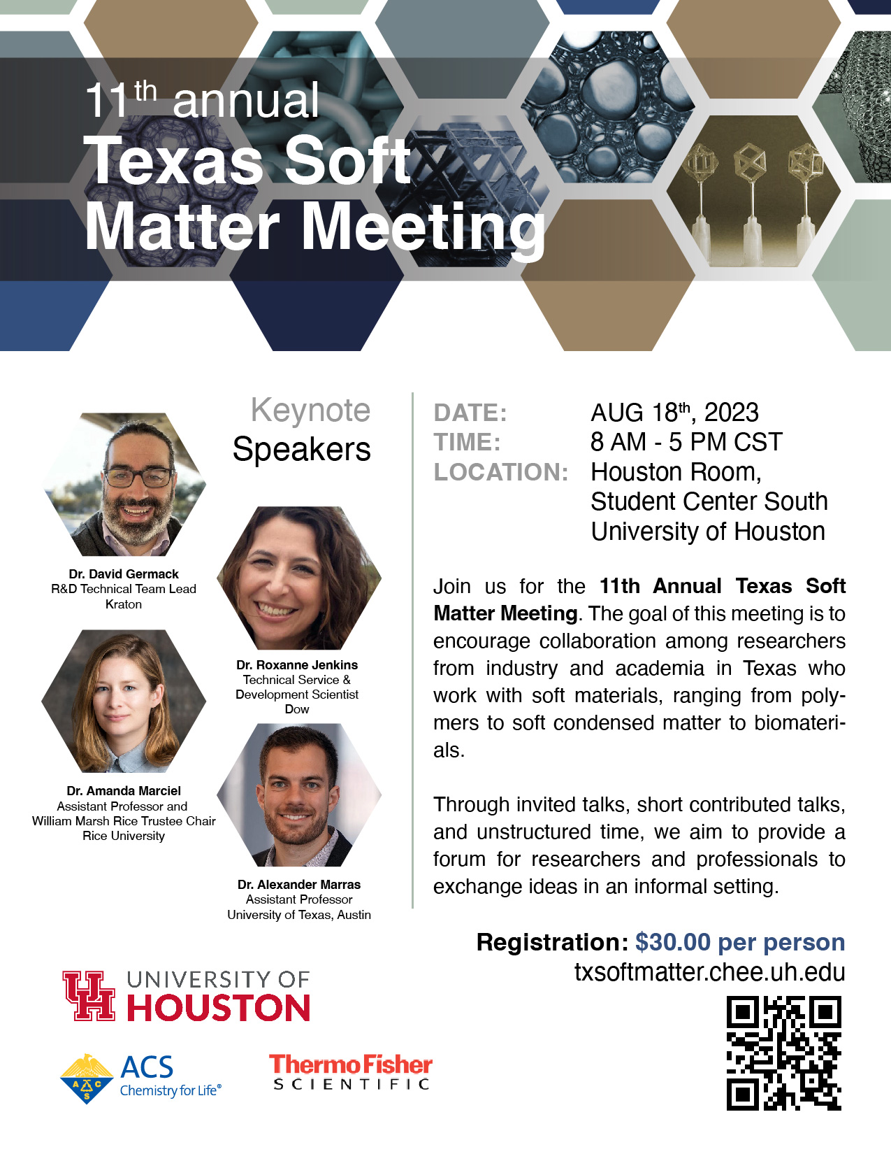 We are pleased to announce that registration is open for the 11th Annual Texas Soft Matter meeting, a local meeting dedicated to fostering collaboration and knowledge exchange in soft condensed matter. We cordially invite you and your students/postdocs to participate in this exciting event.
