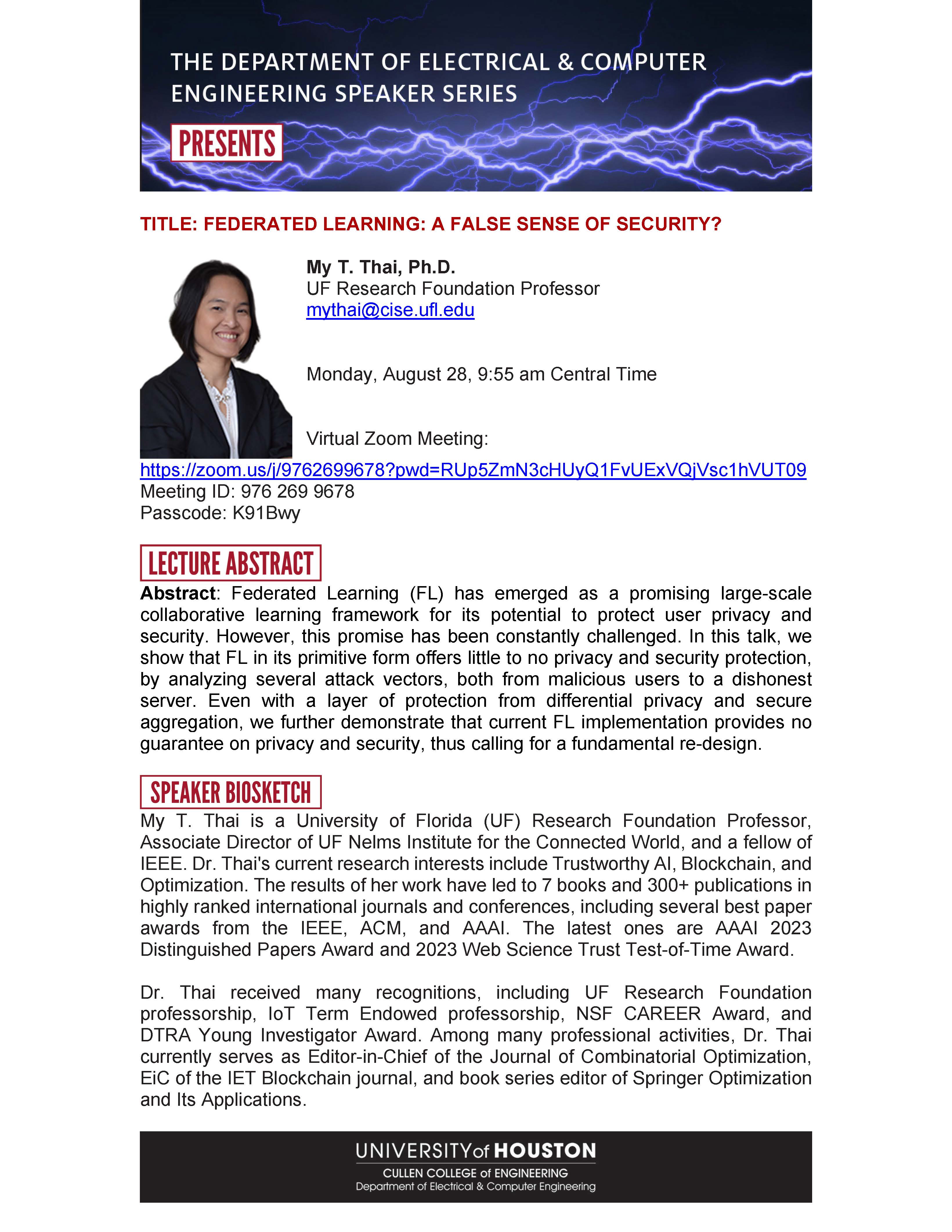 [CCoE Notice] Next Monday's ECE Seminar: Federated Learning: A False Sense of Security?