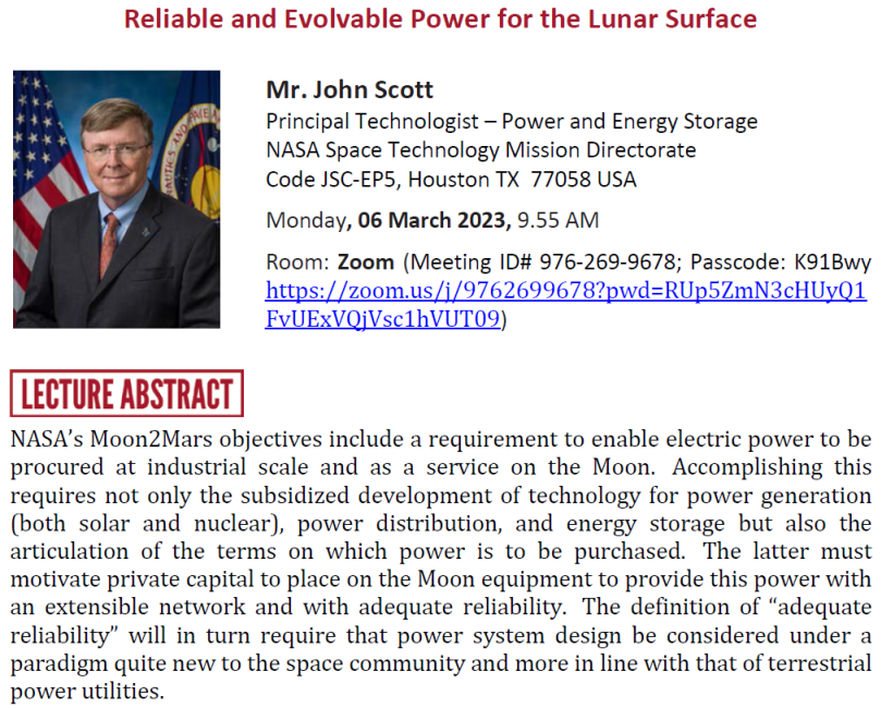 [CCoE Notice] NASA's John Scott (Principal Technologist) presents ECE Seminar talk: "Reliable and Evolvable Power for the Lunar Surface" - on Monday, 06 March 2023 at 10 AM