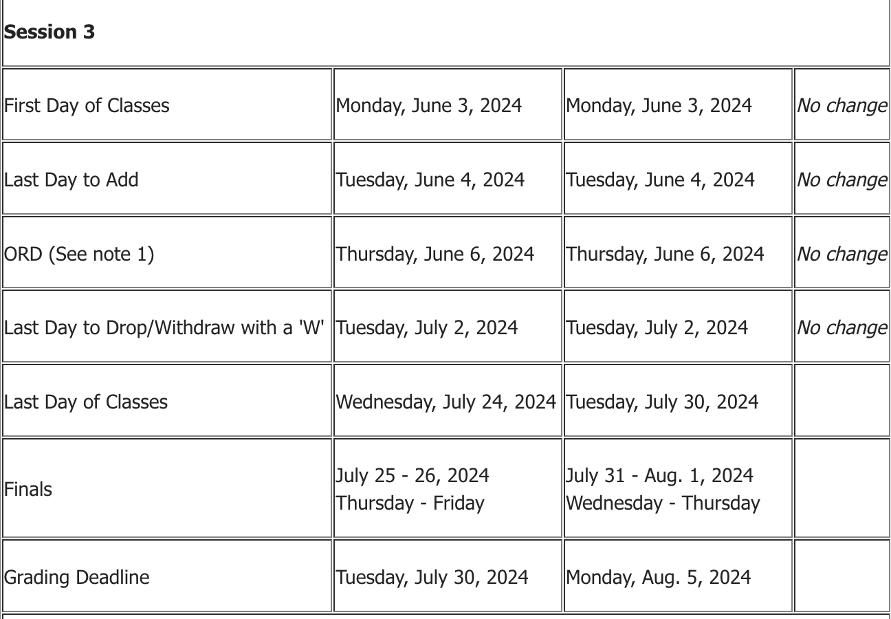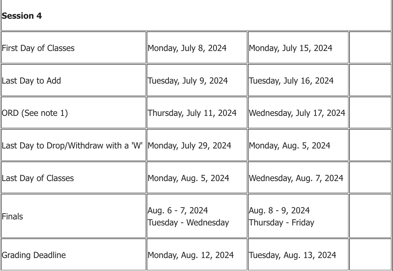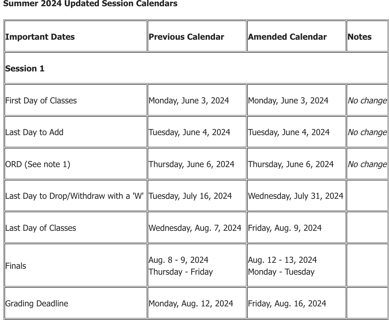 Below you will find important updates regarding the extension of Summer 2024 sessions. As a result of the University’s closure from July 8 - 12, the additional approved days of instruction allow the University to meet the minimum number of contact hours for each session. You will find an updated academic calendar embedded below, as well as links to the academic calendar and final exam schedule.