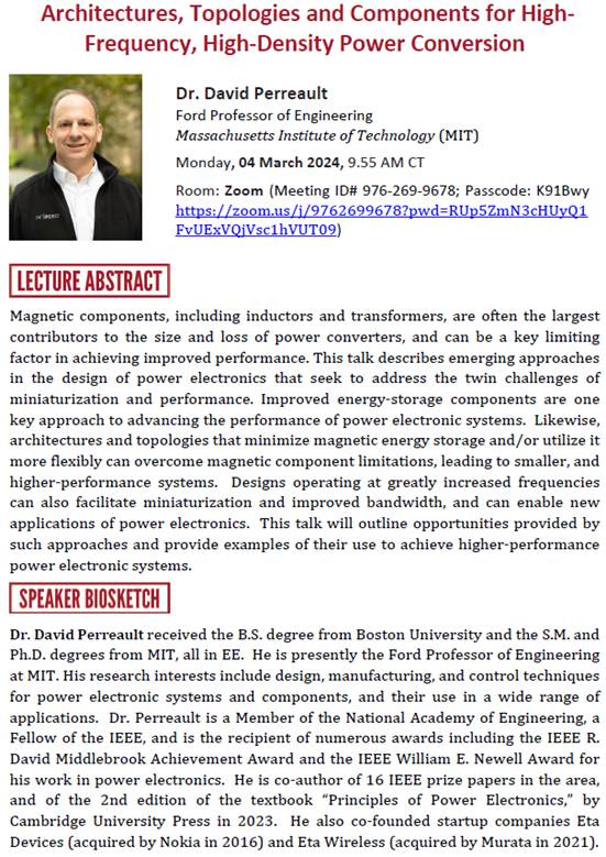 [CCoE Notice] Prof. David Perreault (MIT, MA, USA) presents an ECE Seminar talk: "Architectures, Topologies and Components for High-Frequency, High-Density Power Conversion" - on Monday, 04 March 2024 at 10 AM