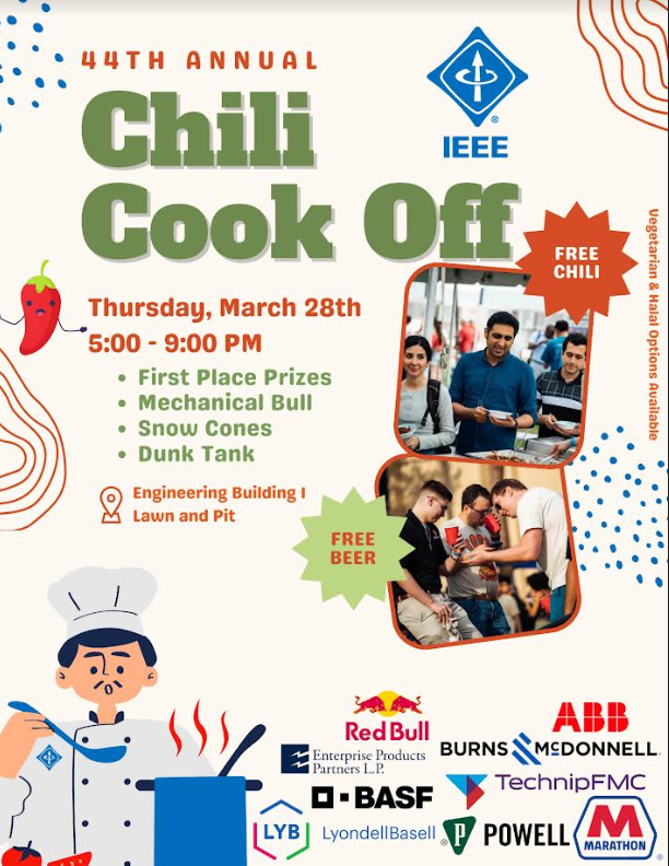 Due to the high likelihood of thunderstorms on Thursday, IEEE's Chili Cook off has been rescheduled to Thursday, March 28th, 4-9 PM.