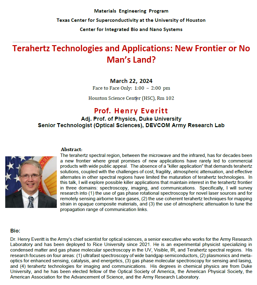 [CCoE Notice] Material Program Seminar: 03.22.2024-Dr. Henry Everitt-DEVCOM Army Research Lab-Terahertz Technologies and Applications: New Frontier or No Man’s Land?