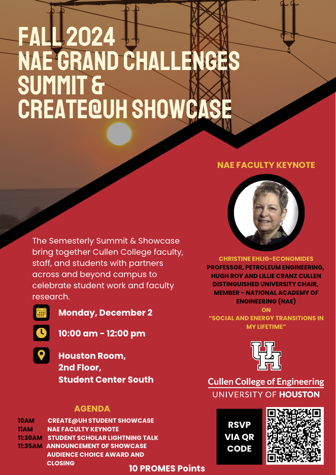 You are invited to close out the semester with your Cullen community at the Fall 2024 NAE Grand Challenges Summit & Create@ UH Showcase! The event is Monday, December 2 from 10 a.m. to Noon in the Houston Room of Student Center South. Details and agenda in poster below, which is also attached to this email.