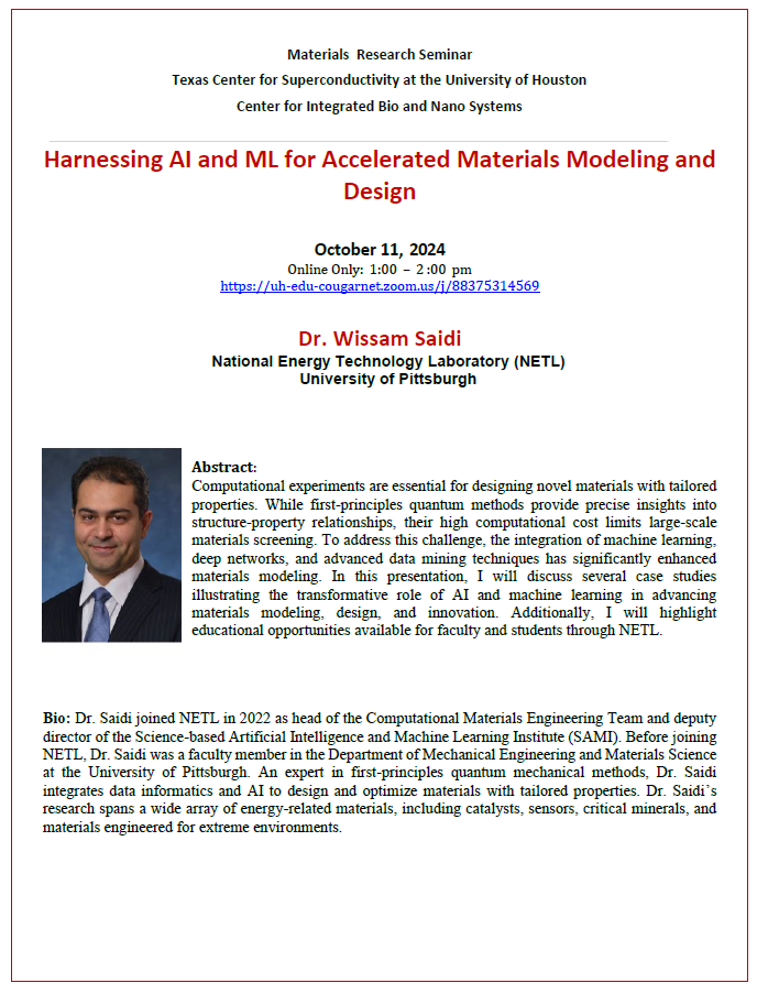 [CCoE Notice] Material Research Seminar: NETL- Dr. Wissam Saidi - Harnessing AI and ML for Accelerated Materials Modeling and Design - 10.11.2024 (Friday)-1:00 PM Online only