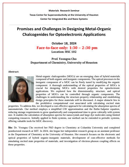 [CCoE Notice] Material Research Seminar on Friday (10.18.2024, 1:30 PM): Yeongsu Cho-UH- Promises and Challenges in Designing Metal-Organic Chalcogenides for Optoelectronic Applications
