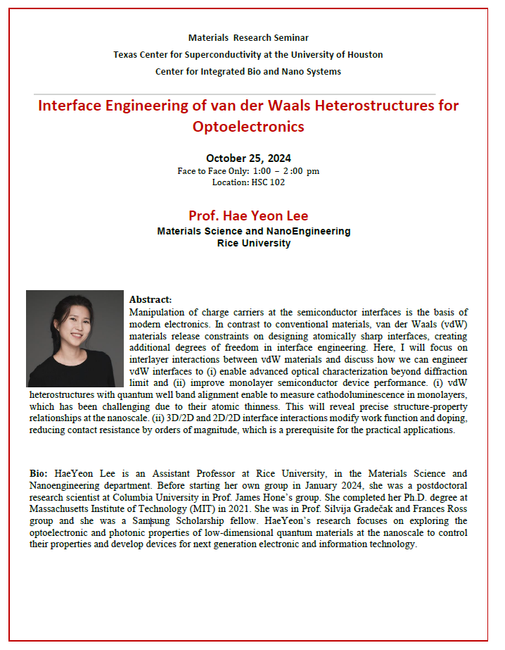 [CCoE Notice] Material Research Seminar: Hae Yeon Lee - Rice University - Interface Engineering of van der Waals Heterostructures for Optoelectronics