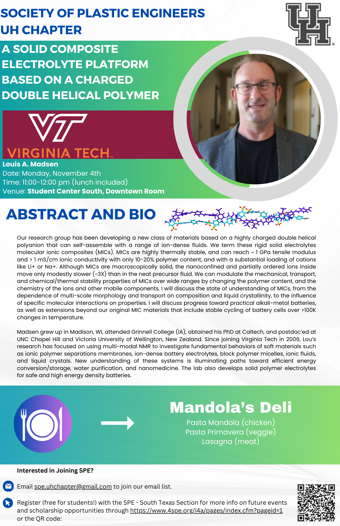 On Monday, November 4th from 11:00-12:00 pm SPE will be hosting Dr. Louis A. Madsen from Virginia Tech. He will give a talk, "A Solid Composite Electrolyte Platform Based on a Charged Double Helical Polymer." This event will be held in the Student Center South, Downtown Room and lunch will be provided by Mandola's Deli serving Pasta Mandola (Chicken), Pasta Primavera (Veggie) and Lasagna (beef).