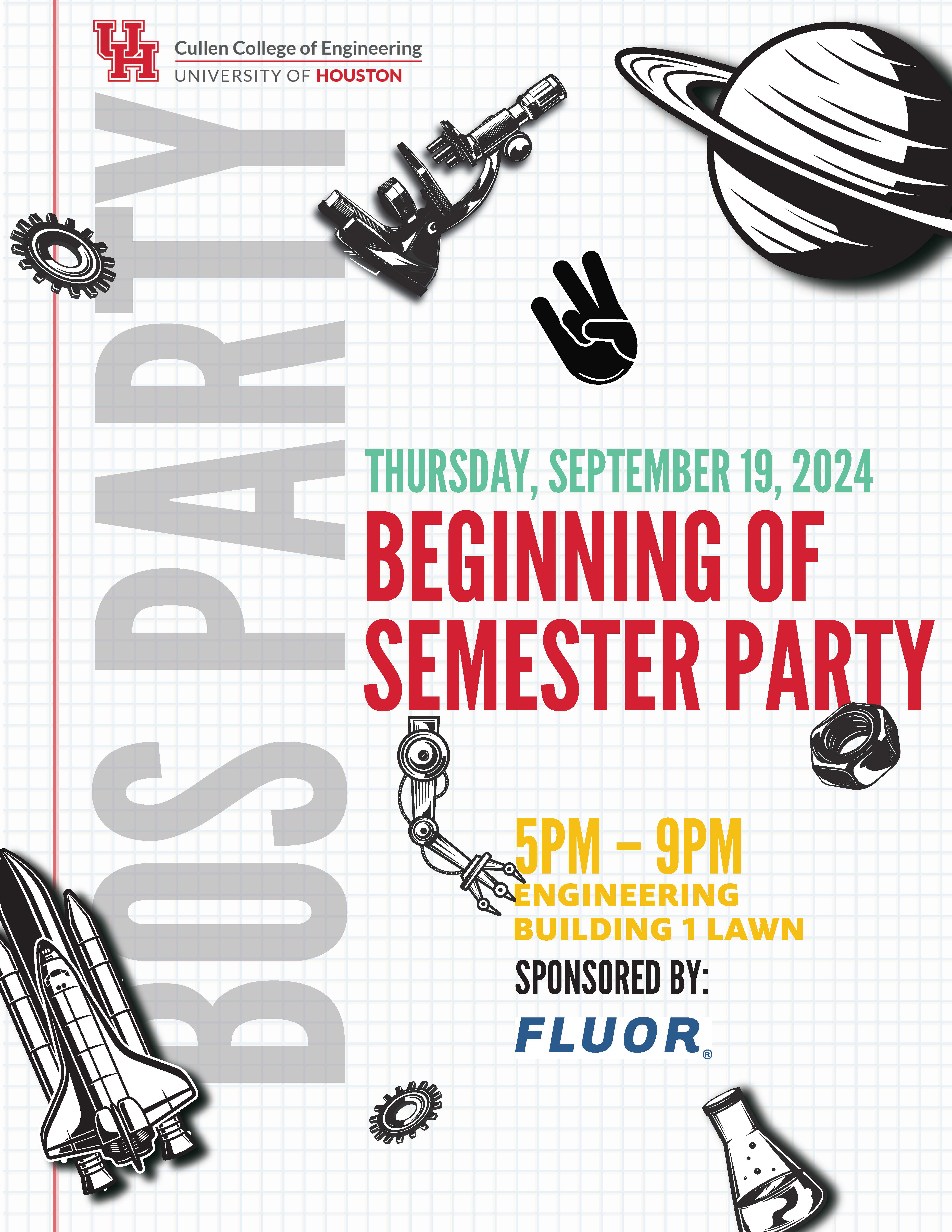 Please mark your calendars and plan to attend the CCE Beginning of Semester (BOS) party on Thurs., Sept. 19, 5-9 pm on the lawn in front of Engineering Building 1, UH Main Campus. All CCE students and faculty are invited to attend and many of our CCE student organizations will be represented. There will be food, music, and many fun activities. Please come out and show your school spirit, make new friends with students and colleagues, and have some fun!