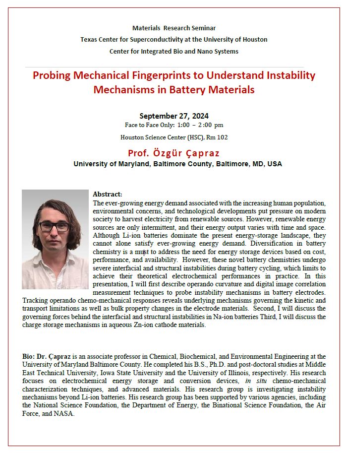 [CCoE Notice] Material Research Seminar: 09.27.2024 (Friday)-Dr. Özgür Çapraz -U of Maryland, Baltimore County, Probing Mechanical Fingerprints to Understand Instability Mechanisms in Battery Materials