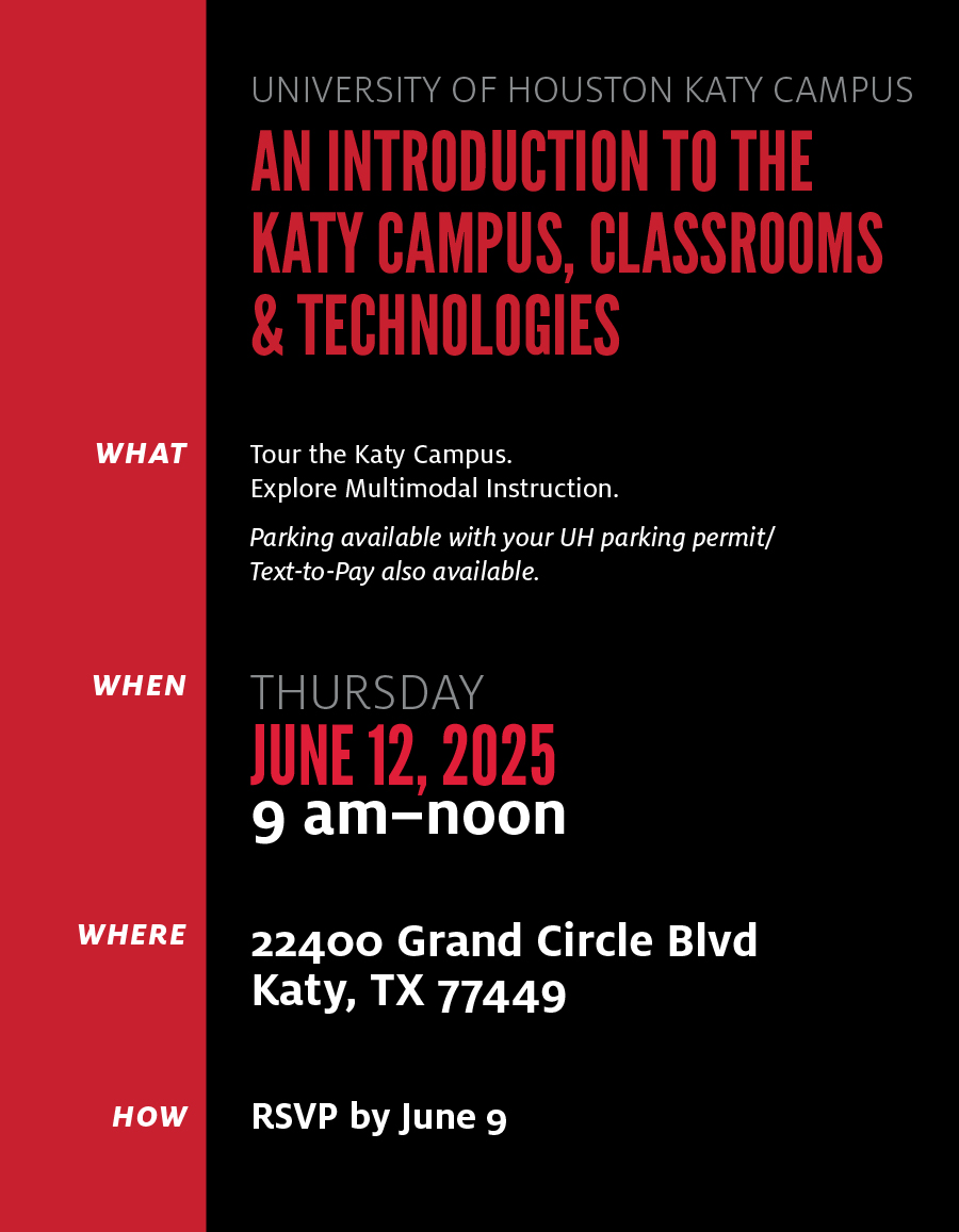 Please make plans to attend this FREE workshop to learn about the University of Houston's Katy Campus and explore its instructional technologies.